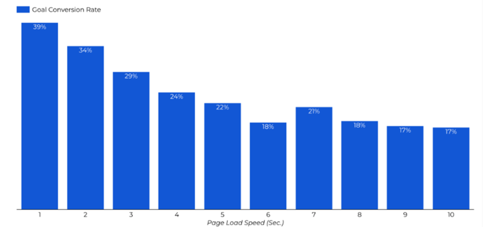 Ein direkter Nutzen der WPO kann mithilfe der Conversion Rate abgeleitet werden. Diese gibt wieder, wie viele der Besucher einer Webseite tatsächlich eine gewünschte Aktion ausführen, also beispielsweise einen Kauf tätigen oder sich zu einem Newsletter anmelden. Die Kennzahl steht neben der allgemeinen Nutzererfahrung in direktem Zusammenhang mit der Effizienz einer Webseite und stellt damit einen präzisen Faktor zu Erfolgsmessung dar. Wie aus Abbildung 4 ersichtlich wird, nimmt die Conversion Rate mit einer längeren Ladezeit einer Webseite ab. Nach einer Zeitspanne von lediglich drei Sekunden sinkt die Rate von 39% auf 29% ab (Izazaga, 2020; Wiegand, 2020).