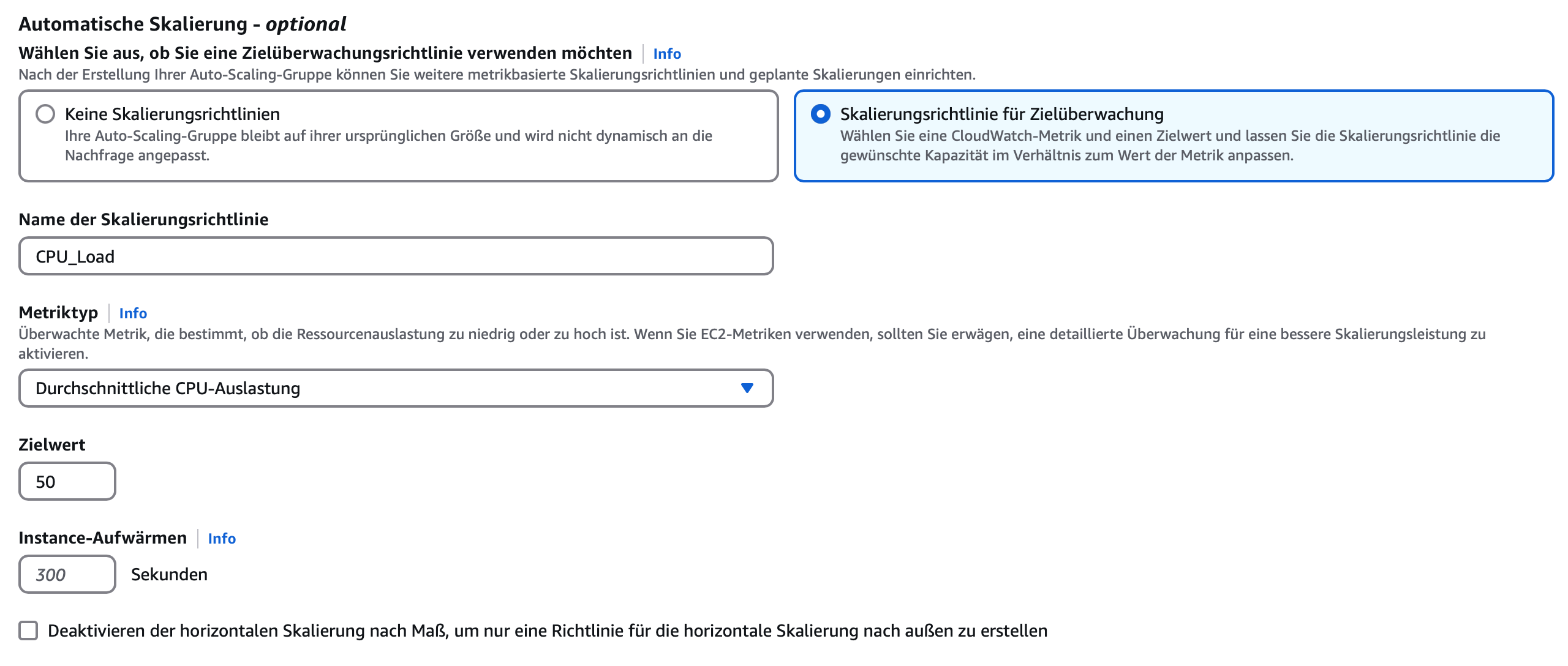 Parallel dazu ergänzt die Auto-Scaling-Group den Load Balancer, indem sie bei Ausfallen einer Instanz, diese abschaltet und automatisch zusätzliche EC2-Instanzen startet. Wir haben zusätzlich noch weitere Skalierungsmetriken wie eine durchschnittliche CPU-Auslastung von 50% hinterlegt.