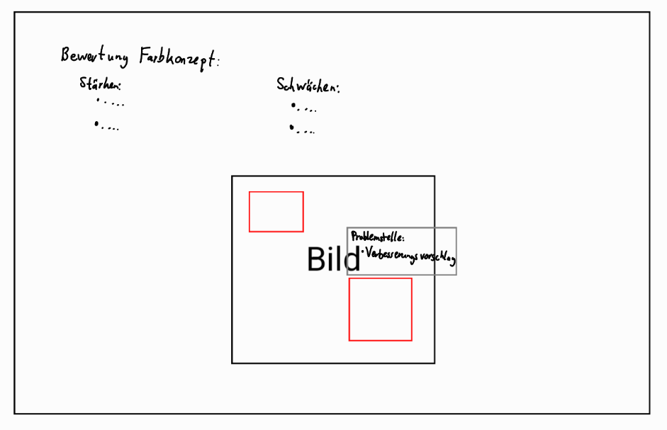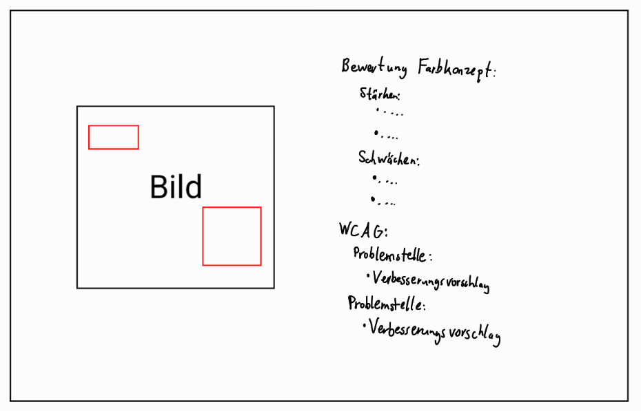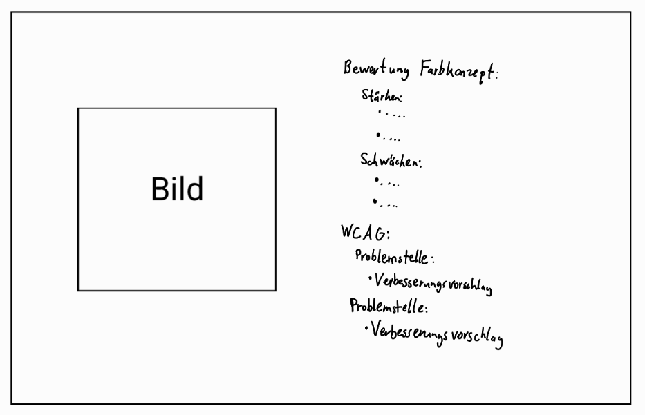 Im zweiten Schritt wurden die Komponenten aus Schritt 1 in einem Paper-Prototyp dargestellt, als Grundlage für die folgende Entwicklung. Dabei wurde in 3 verschiedenen Versionen unterschieden, wobei das Design vor der Analyse immer das Gleiche bleibt. Es ist in Abbildung 1 zu sehen. Auch in diesem Schritt wird die Eingabe-Möglichkeit für eine Webseiten-URL noch nicht mitberücksichtigt, jedoch wird sie später mit implementiert. Die Ausgabe in Version 1 setzt sich, wie in Abbildung 2 zu sehen aus dem Eingabebild und dem textuellen Feedback zusammen. Dabei wird das Eingabebild auf der linken Seite als Orientierung und zur besseren Verständlichkeit des textuellen Feedbacks auf der rechten Seite angezeigt. Das textuelle Feedback unterteilt sich indem erst das allgemeine Feedback angegeben wird und darunter eine Auflistung der einzelnen gefundenen Probleme angegeben wird. Das allgemeine Feedback, welches im Paper-Prototyp noch explizit in Stärken und Schwächen unterteilt wird, wird im späteren Verlauf des Projektes als Kurzer Fließtext angegeben. Bei der Auflistung der einzelnen Probleme ist es wichtig, dass immer das genaue Problem inklusive der Problemstelle benannt wird, ebenso wie der zugehörige Farb-Verbesserungsvorschlag.