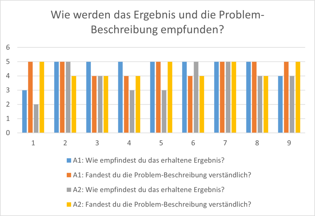 | Abbildung 5: Grafische Darstellung der Testergebnisse zu den Fragen “Wie empfindest du das erhaltene Ergebnis?“ und „Fandest du die Problembeschreibung verständlich?“ |