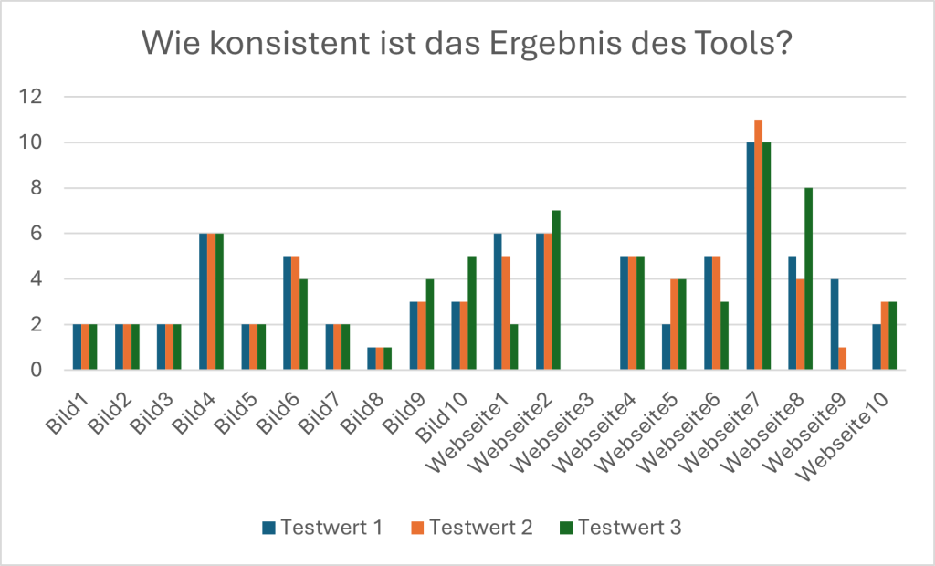 Um diese Frage zu beantworten, sollte laut Jakob Nielsen ein Test mit 20 verschiedenen Testobjekten durchgeführt werden. [15] Daher wurden für den Test 10 verschiedene Bilder und 10 verschiedene Webseiten getestet. Jedes Bild und jede Webseite wurde dafür einmal händisch getestet und dreimal durch das Tool.