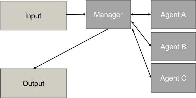 Die Kombination aus Manager und Sequential Workers implementiert Chained Task Sequencing. Ein Orchestrator delegiert eine Sequenz von Befehlen und ist zwischen den Schritten für Kontrolle und Validierung zuständig ist [40]. Das Framework AgentGroupChat-V2 zerlegt Benutzeranfragen in hierarchische Aufgabenbäume, wobei Aufgaben ohne Abhängigkeiten an verschiedene Group Manager verteilt und diese dann parallel ausgeführt werden [72].