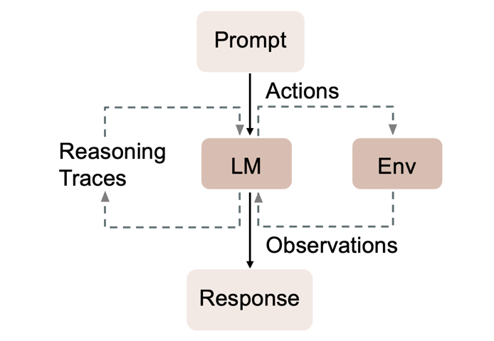 Ausgehend von einem initialen Prompt entscheidet der Agent zunächst, welcher nächste Schritt zielführend ist, beispielsweise das Lösen eines Teilproblems oder das Beschaffen zusätzlicher Informationen. Anschließend führt er eine Aktion aus, etwa eine Code-Ausführung oder einen Zugriff auf eine externe Quelle. Die Ergebnisse dieser Aktionen werden als “Observations” in den Kontext aufgenommen und dienen als zusätzliche Informationsbasis für nachfolgende Reasoning-Schritte, wie [react] zeigt. Auf dieser erweiterten Grundlage entscheidet der Agent über weitere Aktionen oder setzt die Schlussfolgerung fort. Dieser zyklische Prozess aus Denken, Handeln und Beobachten wird iterativ wiederholt, bis eine Lösung erreicht ist. Abhängig von der Aufgabe können dabei auch mehrere Reasoning-Schritte ohne zwischenliegende Aktionen erfolgen [25].