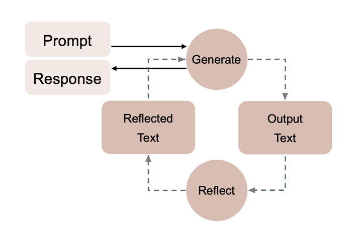 Ein weiteres Reasoning-Pattern ist Reflection. Dabei überprüft ein Agent nach einzelnen Zwischenschritten — etwa nach CoT – oder ReAct-Prozessen — seine bisherigen Ausgaben auf logische Konsistenz, Plausibilität und faktische Korrektheit. Der Agent generiert hierzu explizites Selbstfeedback, identifiziert potenzielle Fehler oder Ungereimtheiten und passt seine Ausgabe entsprechend an [27].