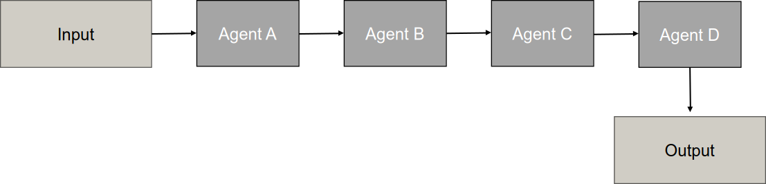 Das Sequential- oder Chain-Pattern ([sequential]) definiert eine Architektur, bei der Agenten in einer vordefinierten, linearen Reihenfolge agieren. Das Kernmerkmal ist die Input-Output-Verkettung: Die Ausgabe eines Agenten dient unmittelbar als Eingabe für den nachfolgenden Agenten in der Sequenz. Der Ablauf ist deterministisch, die Reihenfolge ist fest und wird im gegensatz zu anderen Topologien nicht zur Laufzeit durch ein Orchestrierungsmodell entschieden. Dieses Muster lässt sich mit dem “Pipes and Filters“-Entwurfsmuster oder einer industriellen Montagelinie vergleichen, bei der Aufgaben wie am Fließband weitergereicht werden [36], [37], [44].