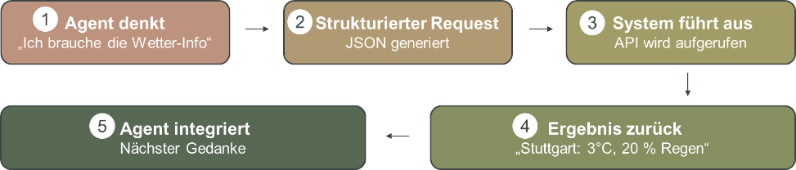 Der technische Ablauf eines Tool-Aufrufs folgt einem zyklischen Prozess, der oft als strukturierte Ausführung beschrieben wird [10]. Dieser Prozess lässt sich in fünf Schritte, wie in [tools] dargestellt, unterteilen: