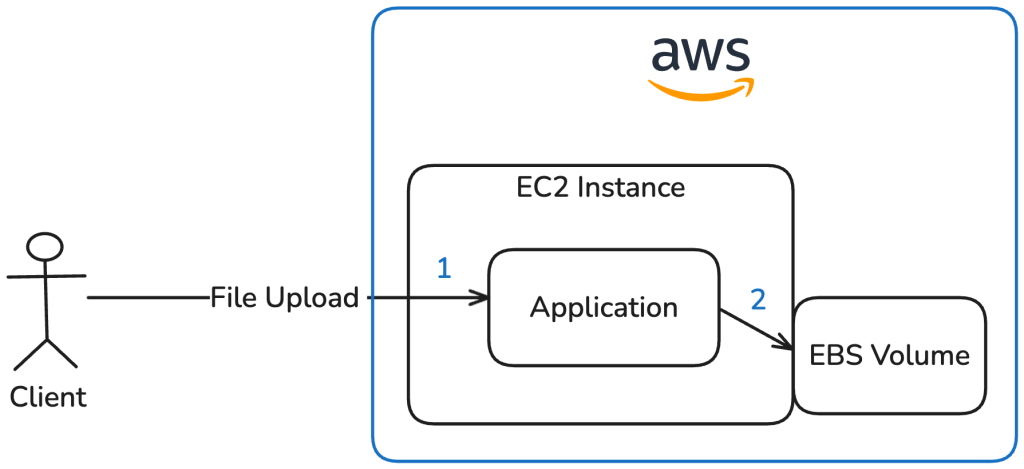 The file is sent as an HTTP request to an application running on an EC2 instance. This application stores the file on an attached Elastic Block Store (EBS) volume.