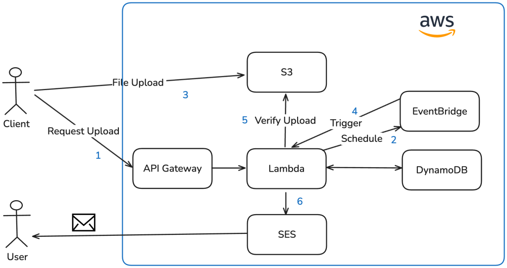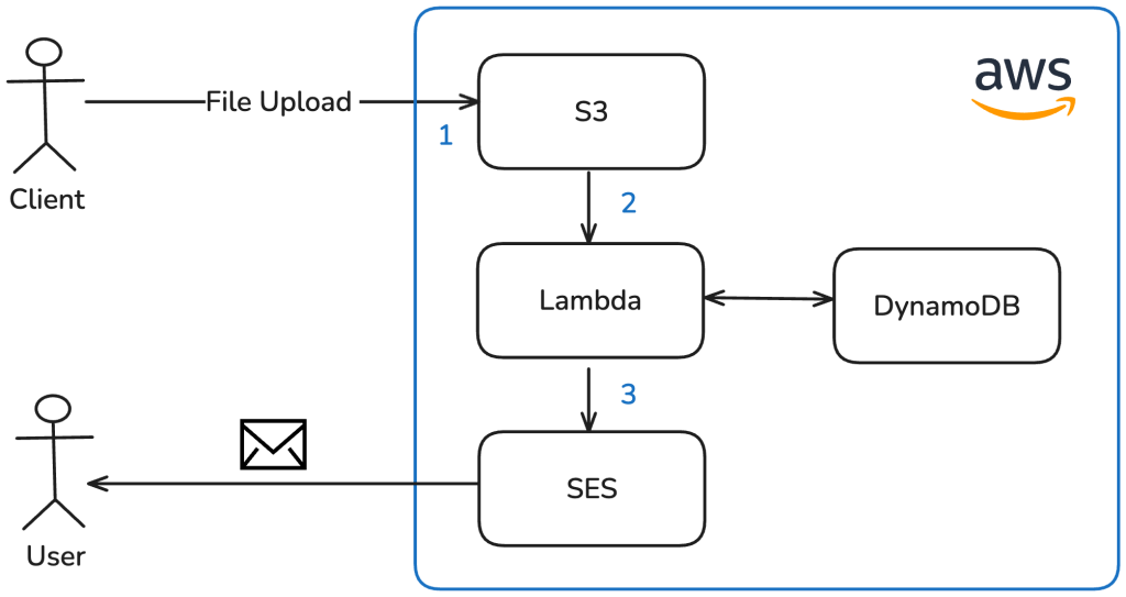The S3 upload event triggers a Lambda function that resolves the file information by its ID and sends an email to the user via SES.