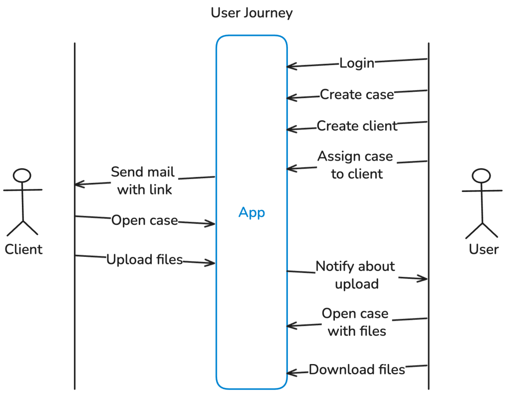 When a user creates a case, the assigned client receives an email with a link that gives them access to it. The system also notifies users when clients upload files to their cases. To avoid notification fatigue, the application should consolidate multiple uploads into a single email rather than sending separate notifications for each file.