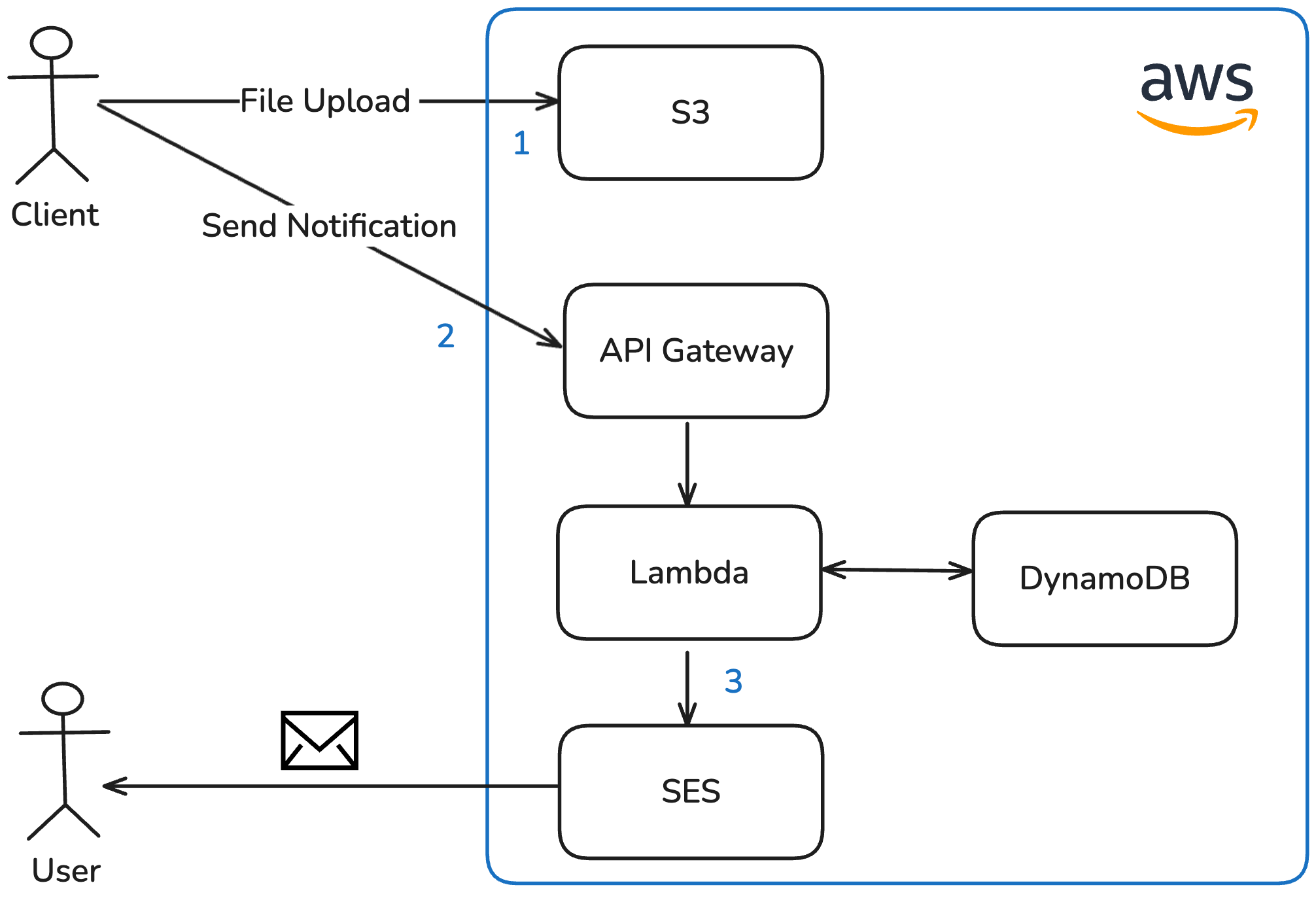 The S3 upload event triggers a Lambda function that resolves the file information by its ID and sends an email to the user via SES.