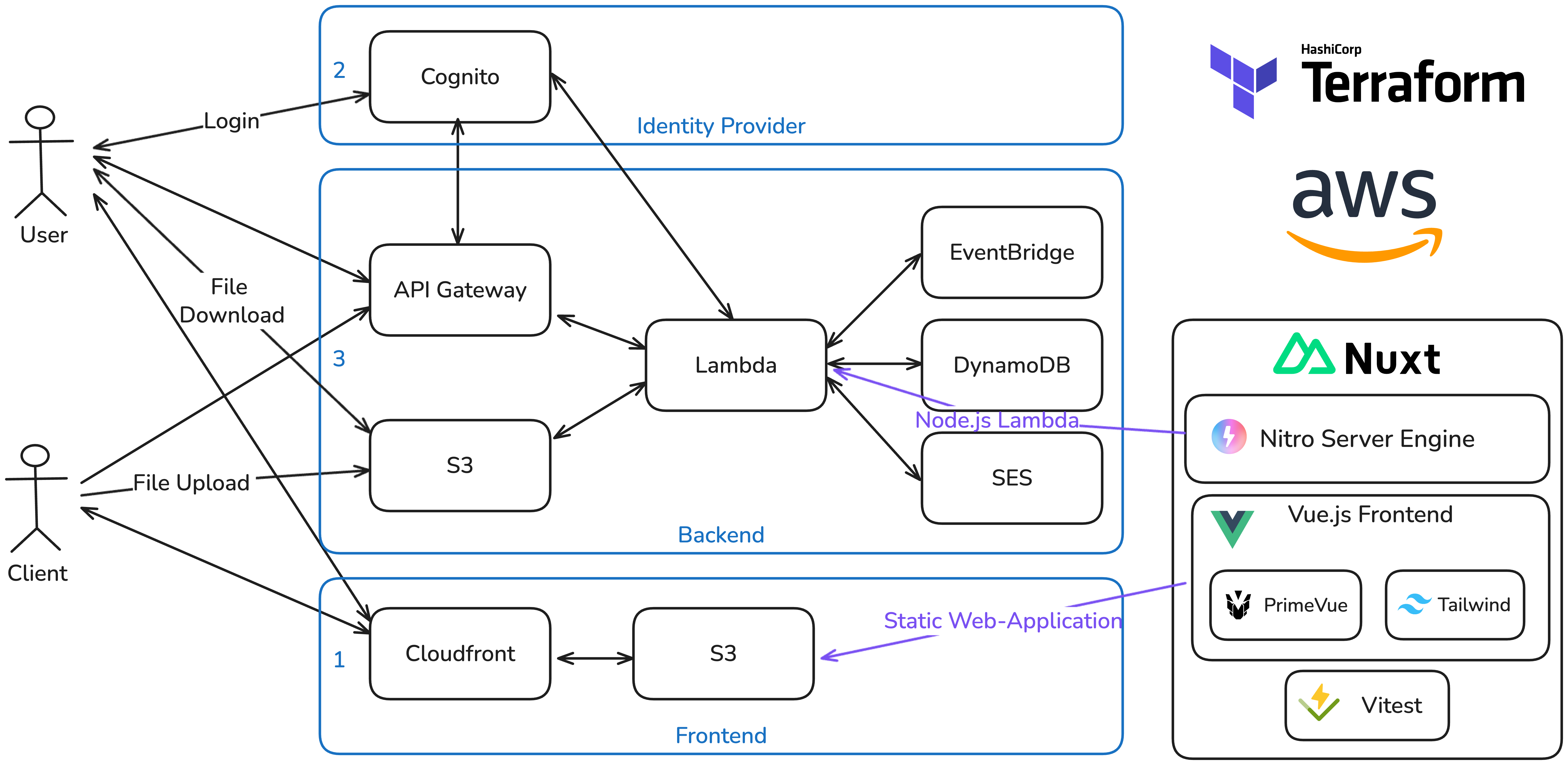 In the deployment process of the frontend, Nuxt renders a server side web-application from the Vue code that is synced to the S3 bucket via a Bash script that also handles the invalidation of the Cloudfront cache to instantly distribute the new frontend version on the CDN.